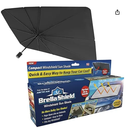 مظلة الزجاج الأمامي: طريقة سريعة وسهلة للحفاظ على برودة سيارتك وراحتك تحت أشعة الشمس الحارقة. تعمل مظلة BrellaShield تمامًا كالمظلة العادية، ما عليك سوى فتحها وتوسيعها لتناسب زجاج سيارتك الأمامي بسهولة.